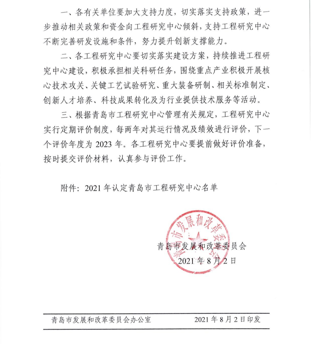2021年認(rèn)定青島市工程研究中心名單(部分)